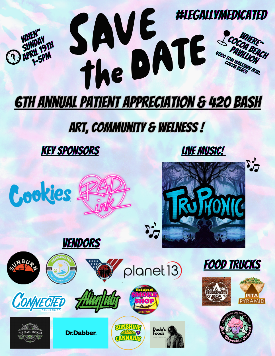 We’re heading back to the beautiful Cocoa Beach Pavilion on Sunday, 4/19 from 1–5 PM for another unforgettable 420 celebration. This year is already shaping up to be bigger and better than ever with our new Key Sponsors Rad Ink and Cookies!